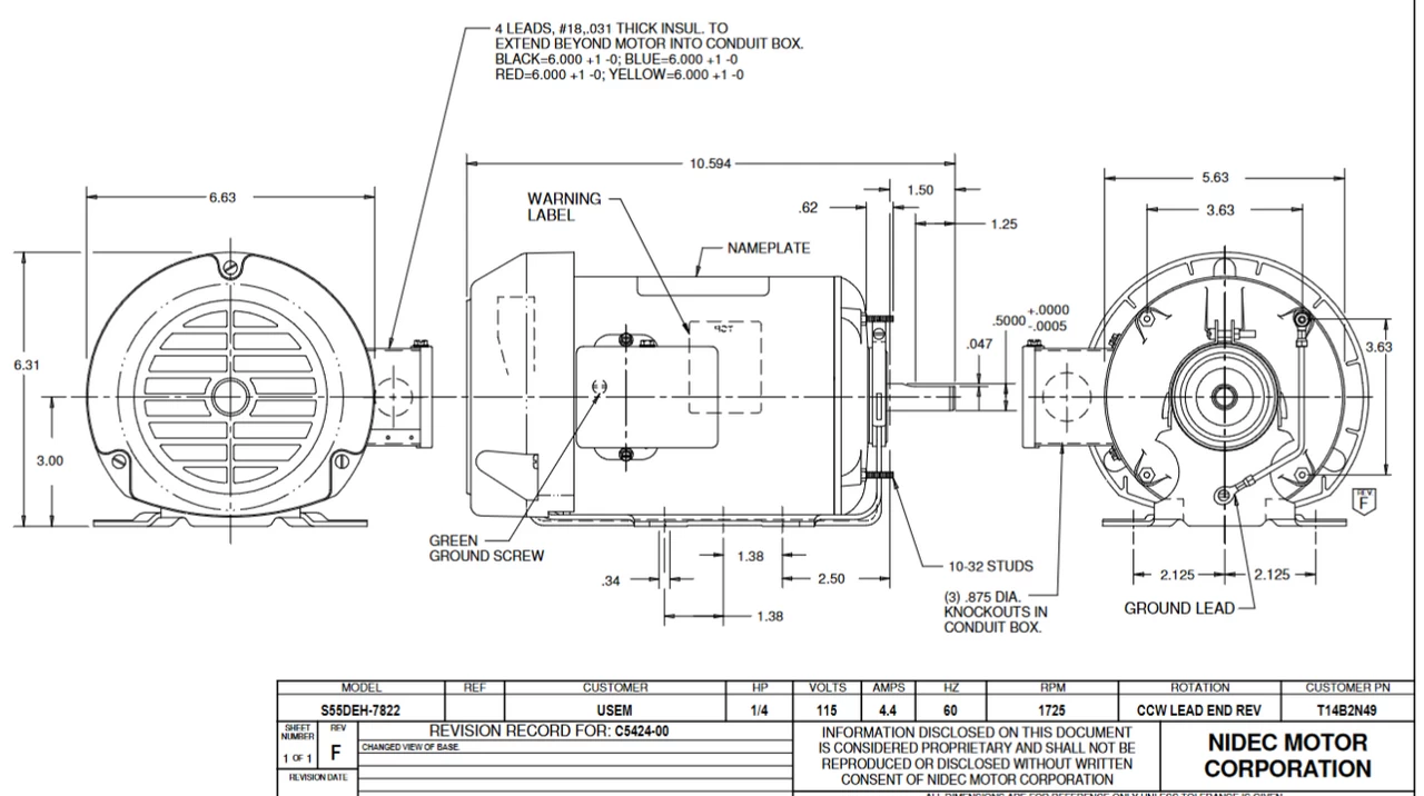 - 1/4 hp 1800 RPM, 4.4 amps 115 Volts 60 Hz Split Phase Motor