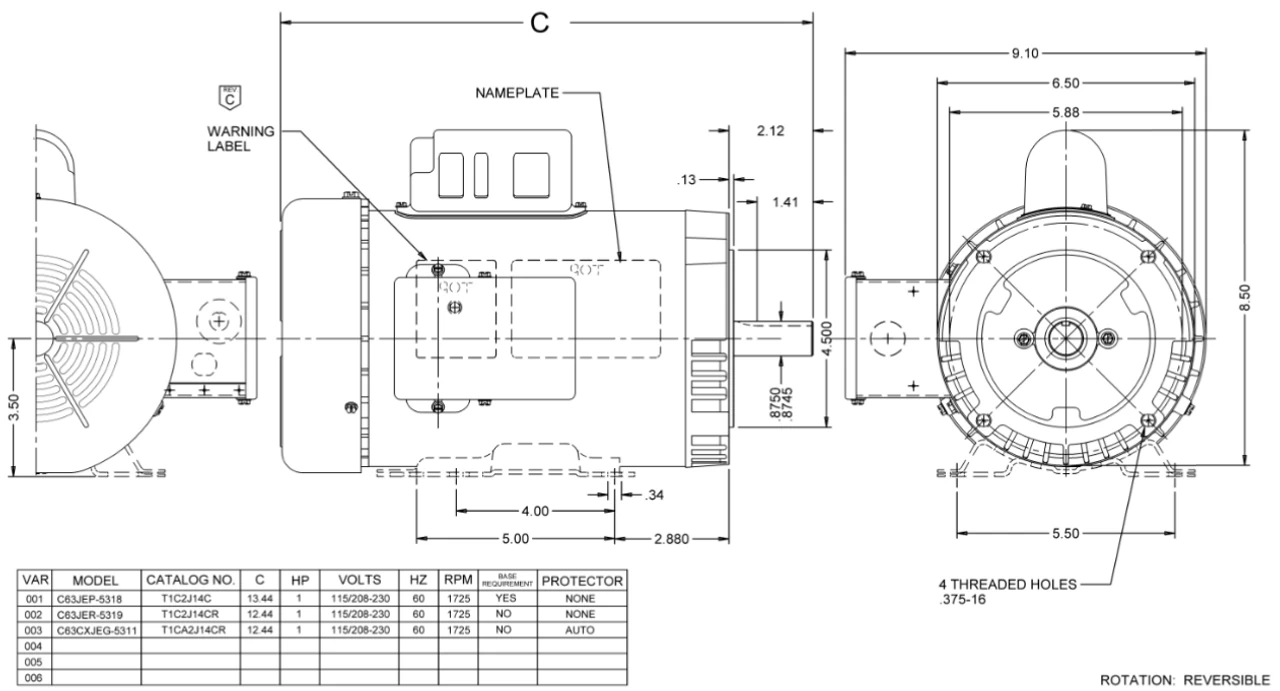 General purpose C-Face motor for pumps, conveyors, air compressors, and blowers. Wiring diagram on motor name plate. TEFC = Totally Enclosed Fan Cooled. T063DBJ1622015B