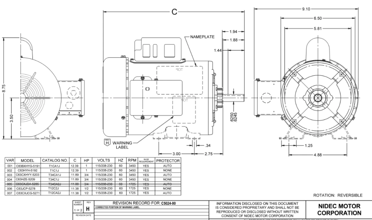 For used on air compressors, pumps, and conveyor requiring high starting torque. Wiring diagram on motor name plate. TEFC = Totally Enclosed Fan Cooled. C063JDH5292015B