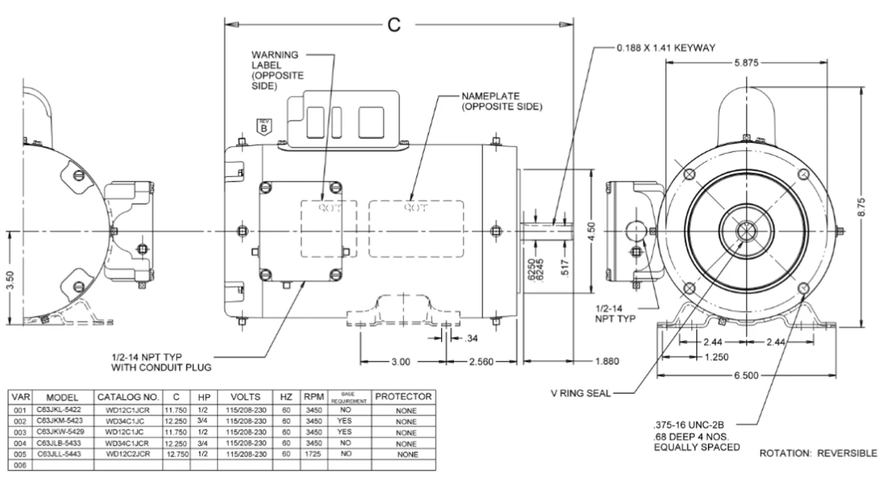 - C-Face Mount, Ball Bearings, Class F Insulation, Reversible