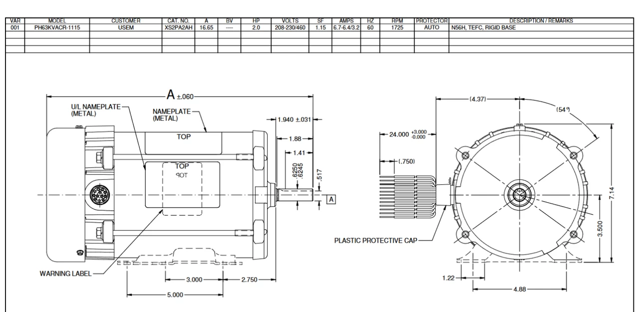 General purpose Division 1 hazardous location motor for class 1 group CD and class 2 group EFG. Wiring diagram on motor name plate. TEFC = Totally Enclosed Fan Cooled. PH63ACR1115015B